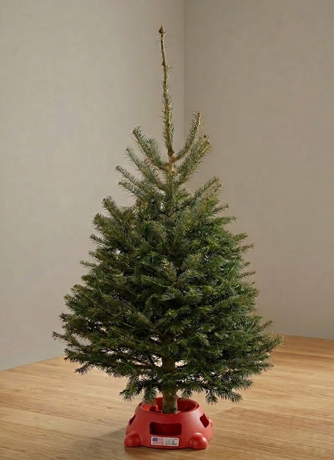 - Ready to Display: Forget the struggle of fitting a trunk into a stand. Every tree comes pre-shaped for a sturdy, red plastic base that provides excellent stability and holds water to keep your tree fresh.